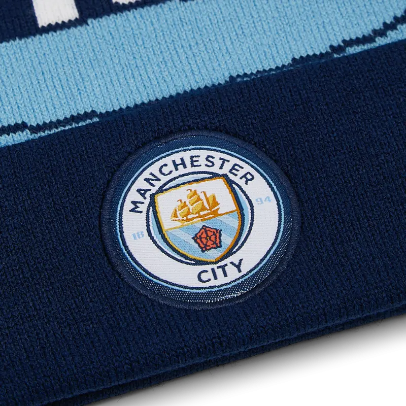 Show your love of Man City and our Mascot Moonchester with this fun knitted kids beanie. This features jacquard knit for Moonchester and also an embroidered crest.